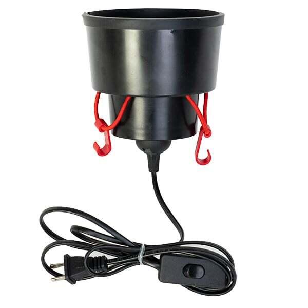 Air is gently heated under your hummingbird feeders, keeping the nectar from freezing. The Hummer Hearth clips easily to the perch of many flat-bottomed hummingbird feeders with an adjustable elastic cord. (All WBU flat-bottomed feeders above 4oz are compatible!) Powered by a 7 Watt bulb, the UL exterior-rated electrical cord plugs into your outdoor extension cord.